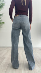 Jeans ampio vita alta. Tasche laterali alla francese. Tasche posteriori. Pences sul davanti. Chiusura frontale con cerniera e bottone. Denim Grigio.