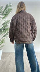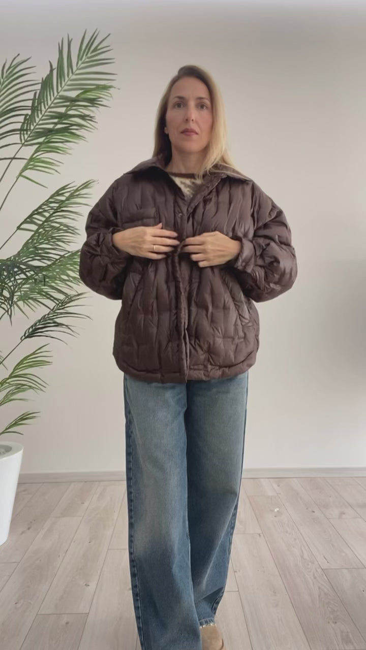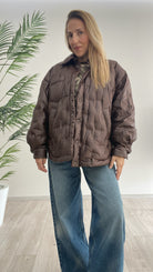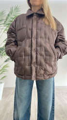 Giubbotto Corto Donna manica lunga con colletto, modello trapuntato in piuma color moro tessuto lucido , tasca a filetto sul petto, chiusura con bottoni a pressione e tasche laterali.
