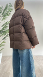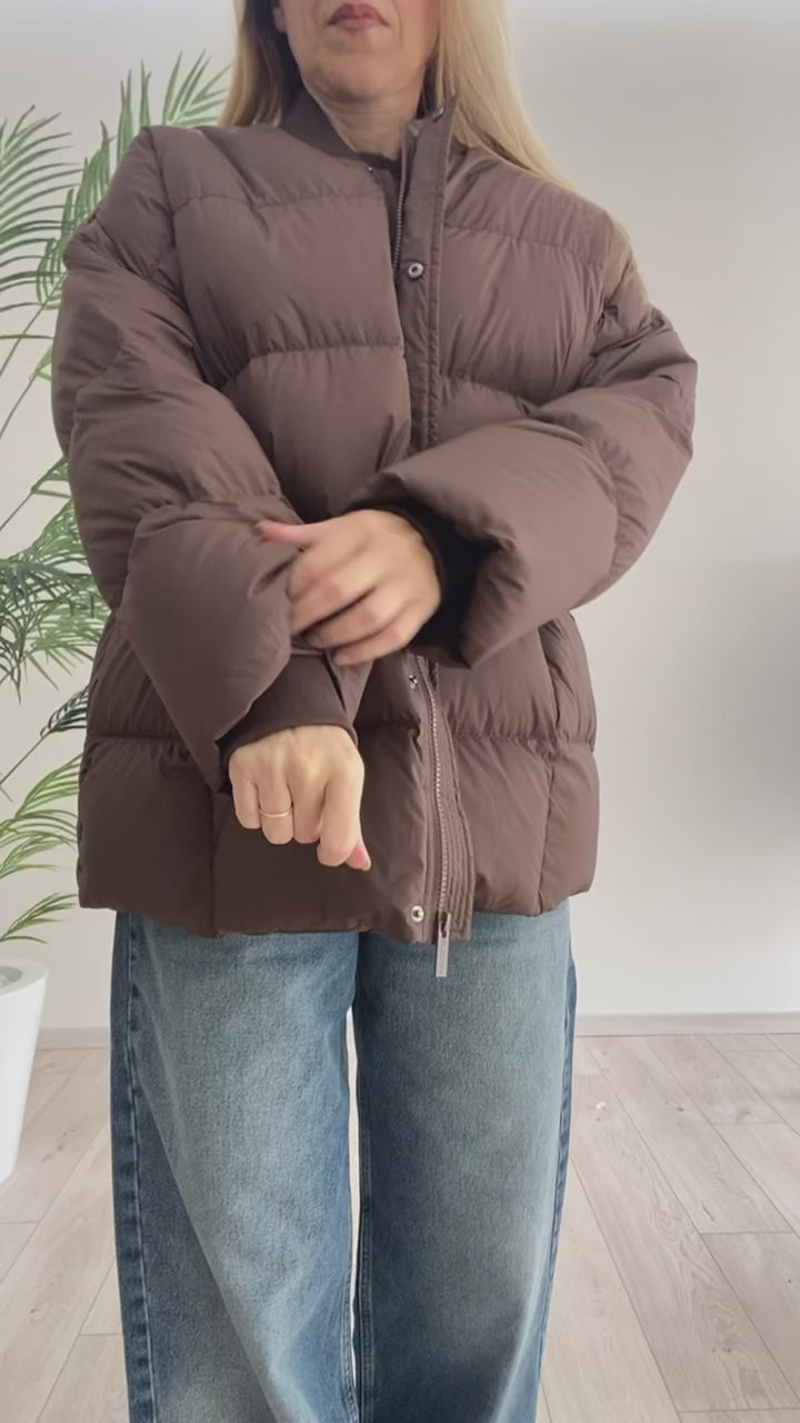 Giubbotto Corto Donna manica lunga con collo alla coreana in piuma , trapuntato colore moro. Tasche laterali e chiusura frontale con bottoni a pressione e zip.