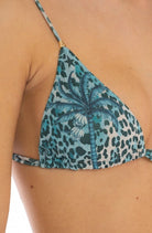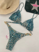 Bikini Pin Up Stars a triangolo scorrevole in morbida lycra con lurex in fantasia maculata con imbottitura estraibile e slip a copertura ridotta con catene e anelli dorati sui fianchi che permettono di regolarne la larghezza intercambiabili con lacetti in dotazione.