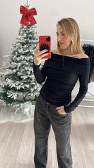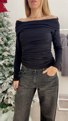 Maglia Nera Vicolo in jersey manica lunga con scollo a shiffer e drappeggio laterale.