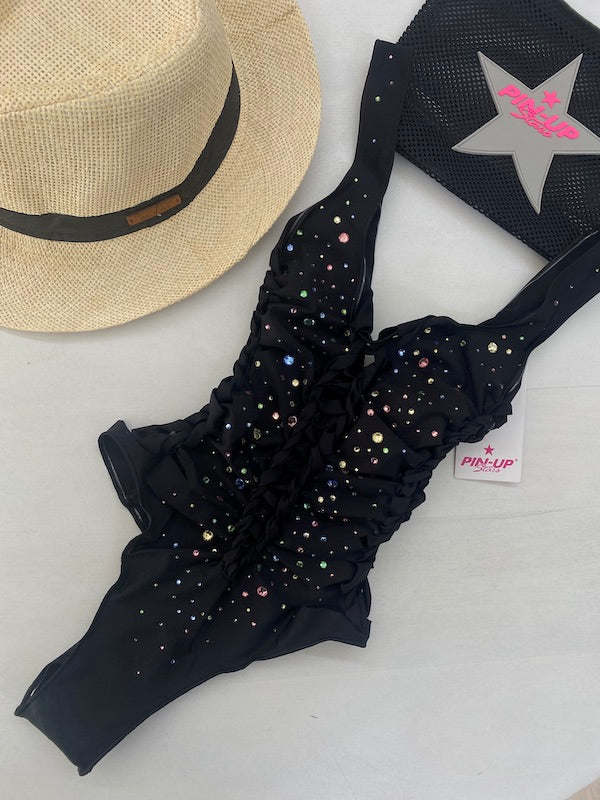 Costume da bagno intero Donna Pin Up Stars in morbida lycra Nera con cut-out laserato, impreziosito da applicazioni strass multicolore senza imbottitura.