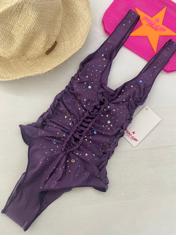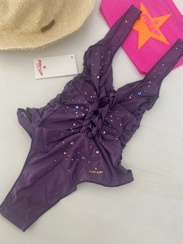Costume da Bagno Intero Pin Up Stars Cut Out Pioggia Strass Viola