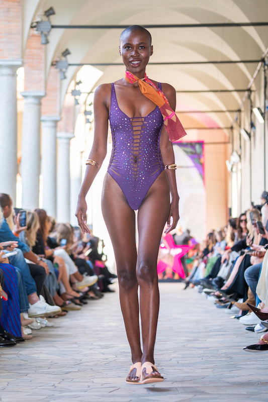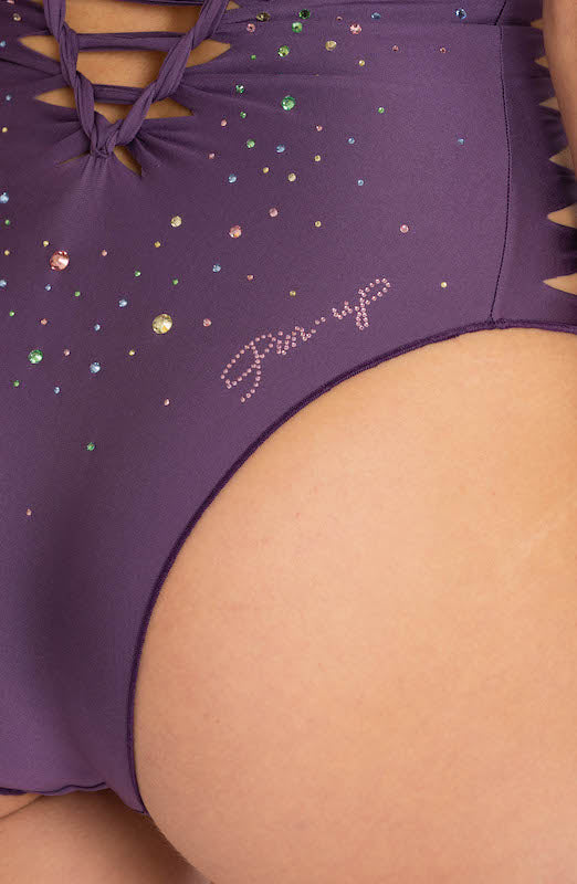 Costume da bagno intero Donna Pin Up Stars in morbida lycra Viola con cut-out laserato, impreziosito da applicazioni strass multicolore senza imbottitura.