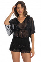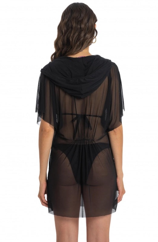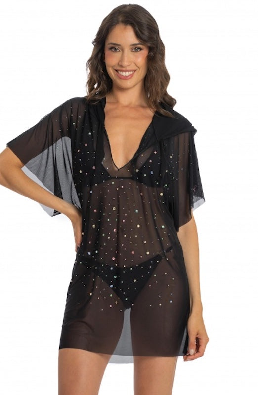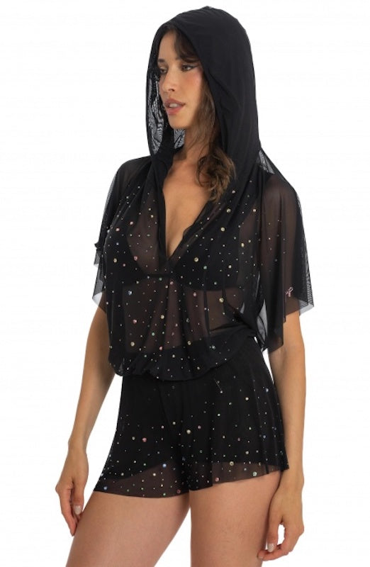 Blusa con cappuccio Pin Up Stars in microrete nera con applicazione di strass, scollo V con allacciatura al collo.