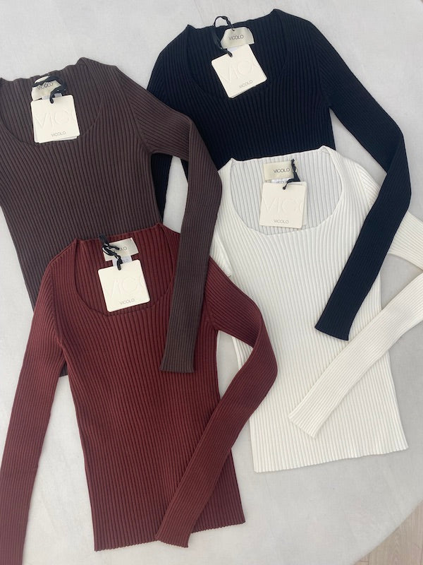 Maglia maniche lunghe a coste larghe con scollo quadrato.