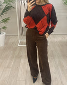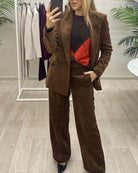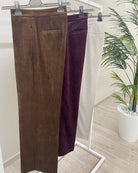 Pantalone Donna Vicolo modello ampio con pieghe frontali in velluto rocciatore. Chiusura con zip e bottone ricoperto. Con tasche laterali alla francese. Tasche posteriori a filetto.