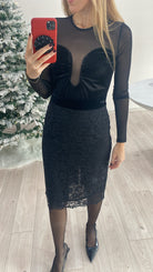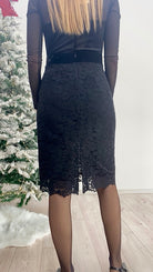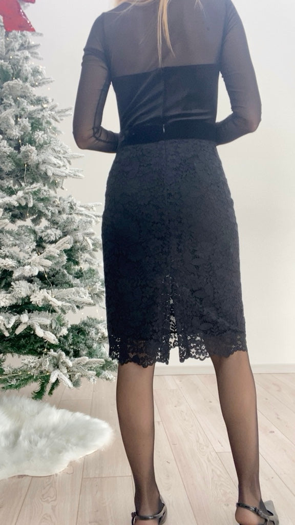 Gonna midi Vicolo in pizzo con spacco sul retro. Chiusura con zip invisibile sul retro ed elastico in vita in velluto.
