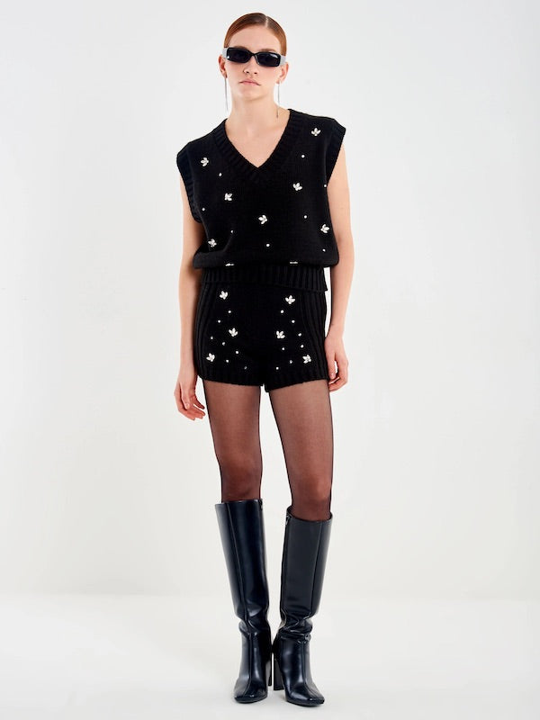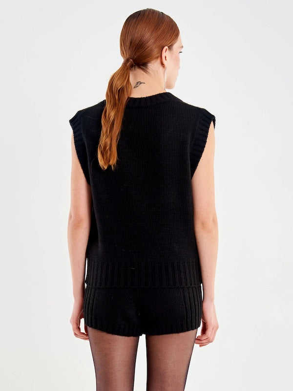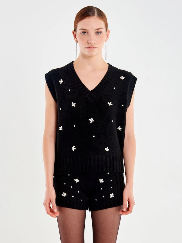Gilet Donna Vicolo scollo a v fit boxy con cabochon. Finiture in maglia a coste.