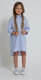 Vestito per bambina Vicolo Girl fantasia righe, modello camicia con colletto e 3 bottoni, maniche 3/4 con polsino e 2 bottoni. Lunghezza asimmetrica. Comosizione 100% cotone, colore azzurro/bianco. Taglie disponibili 6 ANNI ( ALTEZZA CM 116 - BUSTO 58 -FIANCHI 53 - BACINO 60 ), 12 ANNI ( ALTEZZA CM 152 - BUSTO 72 - FIANCHI 63 - BACINO 79 ).