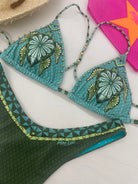 Bikini Pin Up Stars in lycra operata bicolor Verde effetto squame con dettagli dorati a Triangolo imbottitura estraibile con ricamo Tartaruga dotato di applicazioni di palline oro e laccetti ad incrocio sulla schiena abbinato a slip a copertura ridotta .