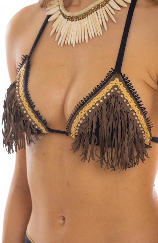 Bikini Donna Pin Up Stars triangolo scorrevole con imbottitura estraibile in lycra tinta unita con frange laserate dainetto e ricamo di perline effetto legno a contrasto. Profili in dainetto impreziosiscono lo slip a copertura ridotta.