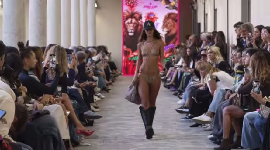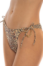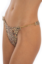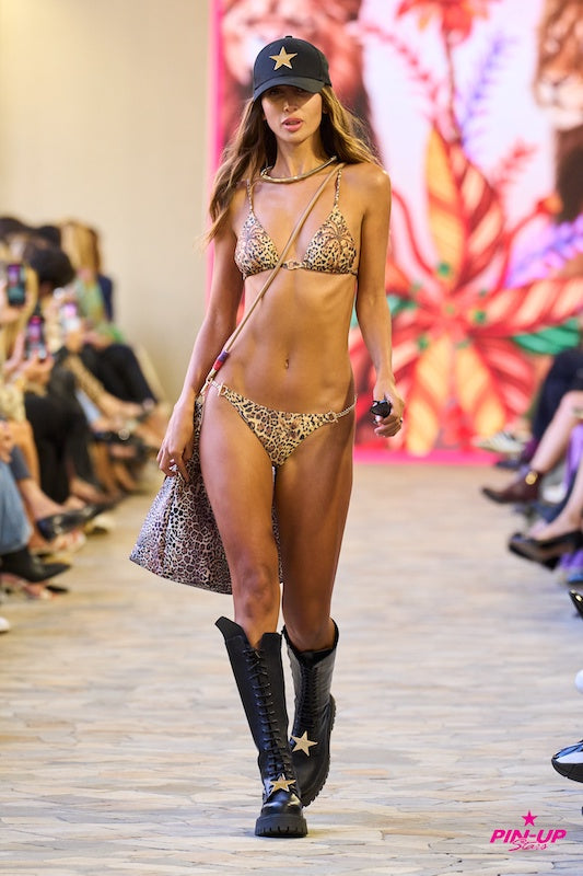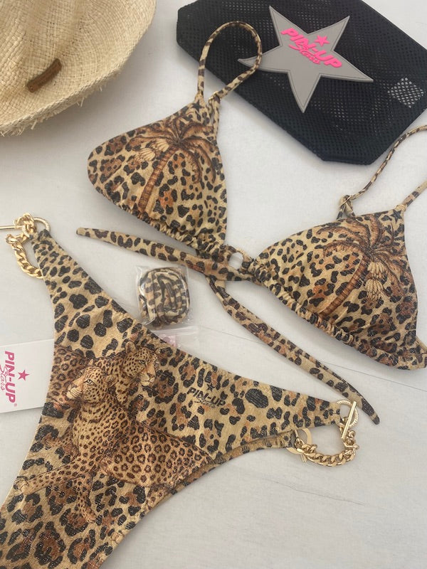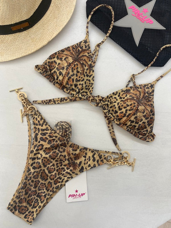 Bikini Pin Up Stars a triangolo scorrevole in morbida lycra con lurex in fantasia maculata con imbottitura estraibile e slip a copertura ridotta con catene e anelli dorati sui fianchi che permettono di regolarne la larghezza intercambiabili con lacetti in dotazione.
