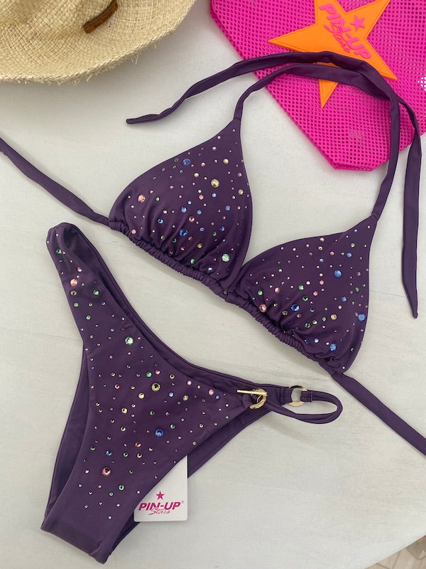 Costume da Bagno Donna Pin Up Stars a triangolo scorrevole in lycra viola con imbottitura estraibile ornato da strass multicolore.
