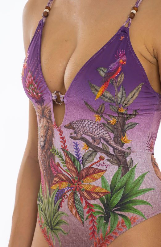 Costume da Bagno Intero Donna Pin Up Stars con stampa Lion King impreziosito da delicati cristalli trasparenti che catturano la luce in lycra con texture effetto rete, dotato di imbottitura interna estraibile e doppie bretelline che assicura maggiore sostegno e comfort. Al centro, l’anella in legno di cocco aggiunge un dettaglio naturale e ricercato. I lacci sulla schiena creano un incrocio sensuale e femminile . Arricciatura posteriore che esalta il lato B.