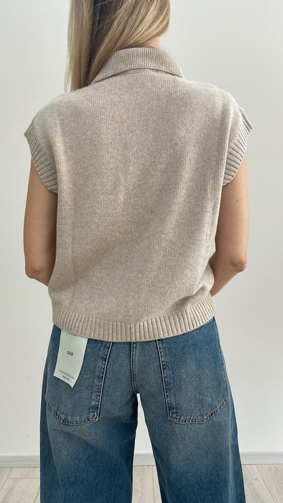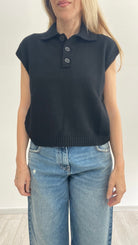 Gilet Donna in maglia con scollo a polo con 3 bottoni, profili a coste.