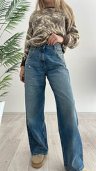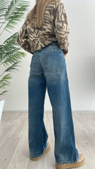 Jeans Donna Mia modello over a cinque tasche. Chiusura frontale con zip e bottone in metallo. Vita media, gamba ampia. Lavaggio Denis blu effetto slavato. Baggy Fit.