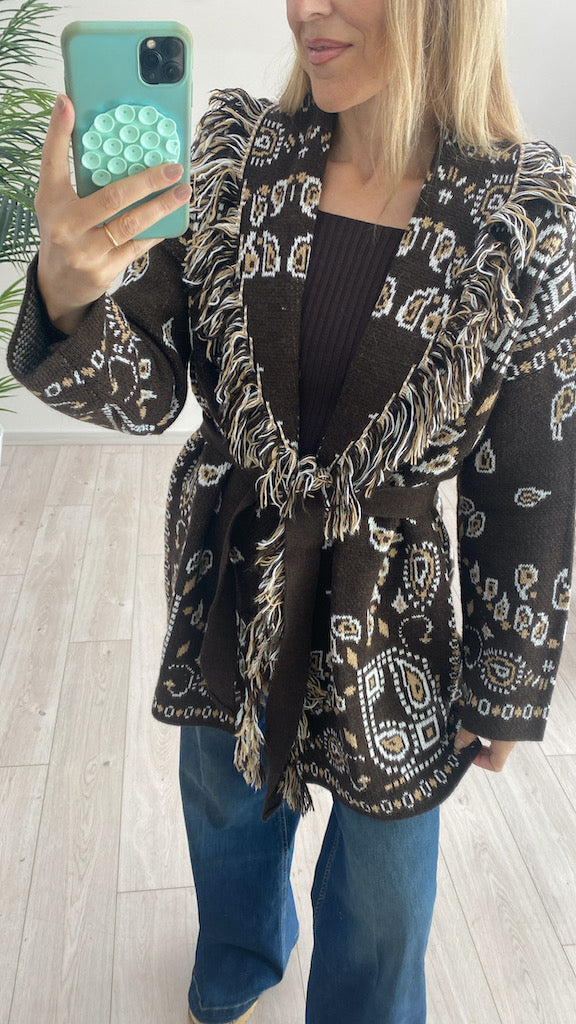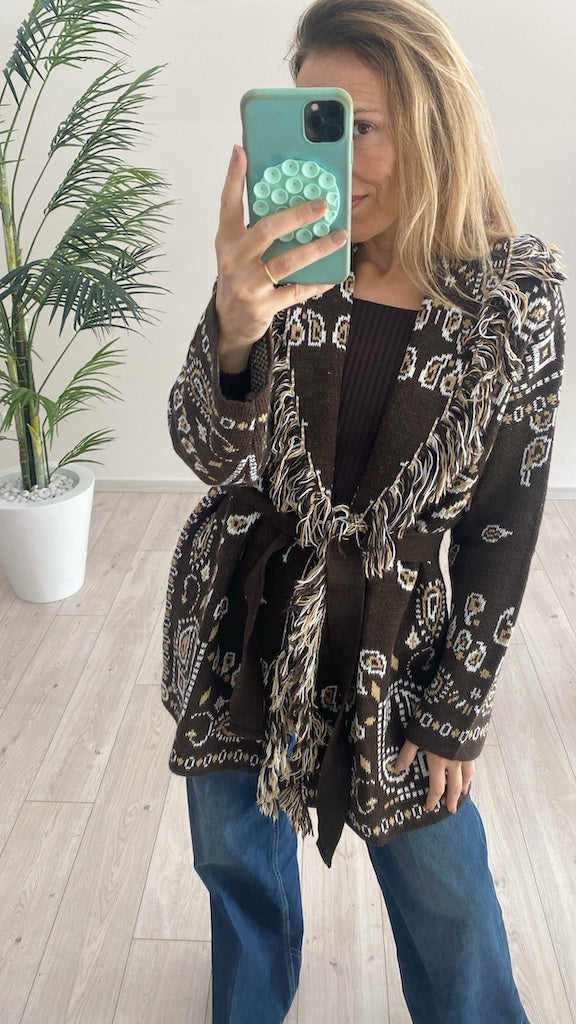 Maxi cardigan Donna fantasia jacquard paisley con maniche lunghe e cintura. Dettaglio frange su profilo e collo.