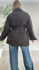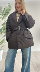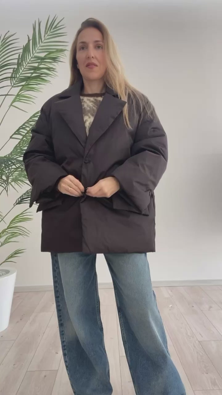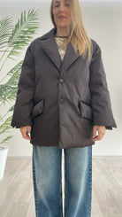 Giubbotto Corto Donna manica lunga con imbottitura in piuma, collo a revers dotato di cintura in vita e spacco sul retro. Chiusura frontale con bottoni e tasche laterali .
