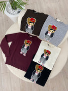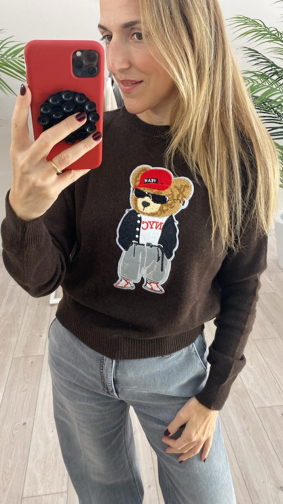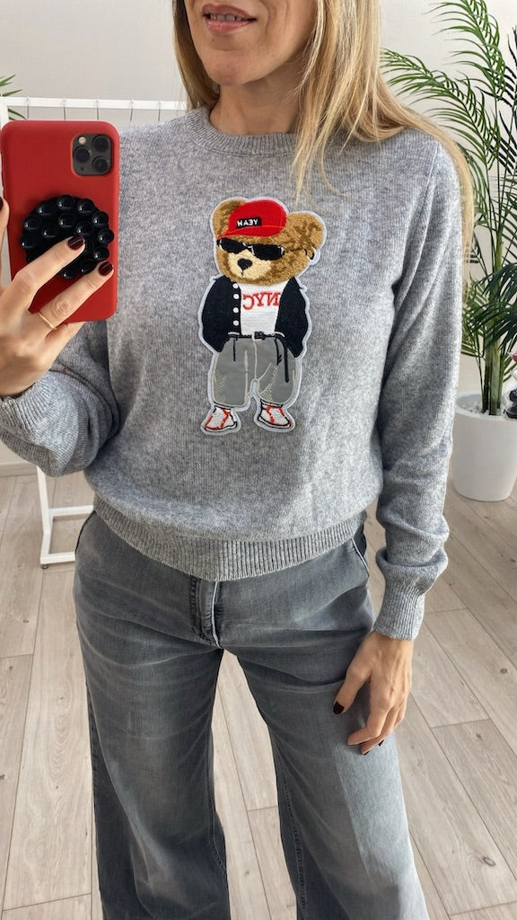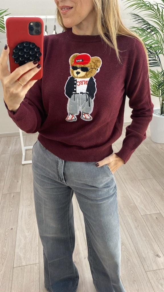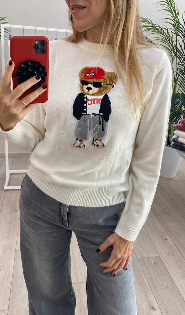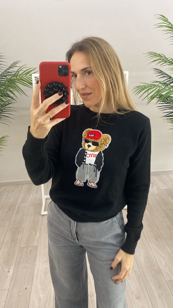 Pullover Donna girocollo Vicolo maniche lunghe con orsetto ricamato NYC , profili a coste.