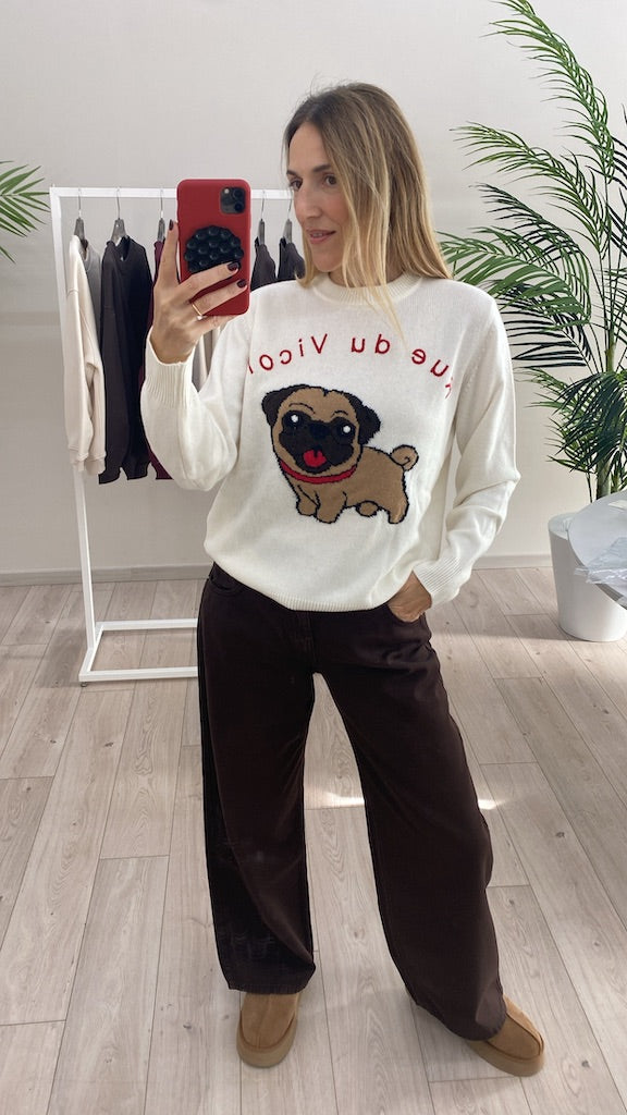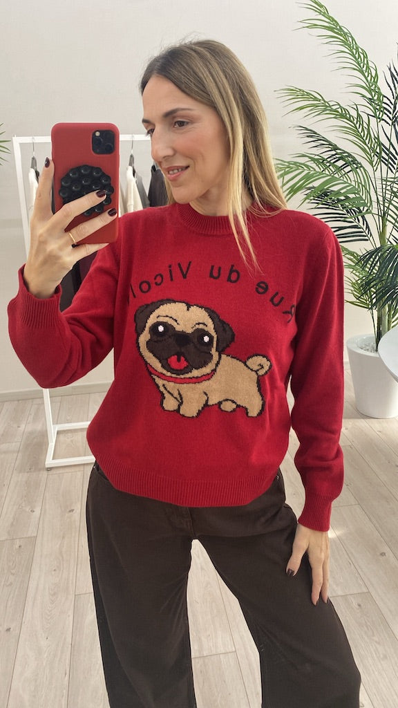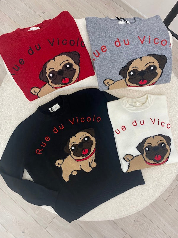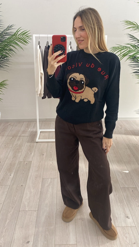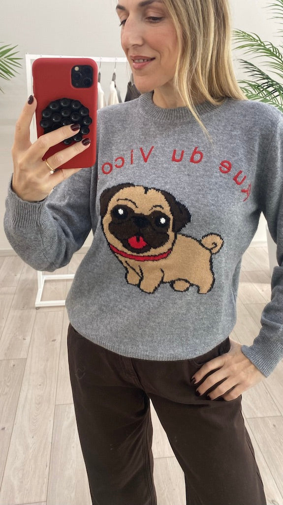 Pullover Donna Vicolo maniche lunghe girocollo con ricamo cagnolino carlino e scritta Rude du Vicolo.