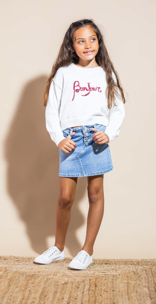 Minigonna in jeans bambina Vicolo Girl , tasche davanti e dietro, chiusura con cerniera e bottone. Composizione 98% cotone e 2% elastan. Taglie disponibili 10 anni ,12 anni.