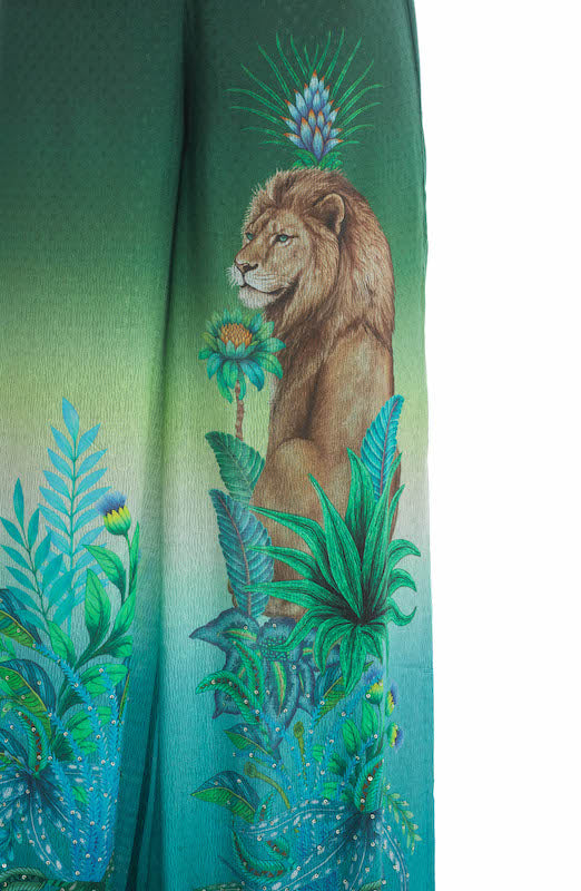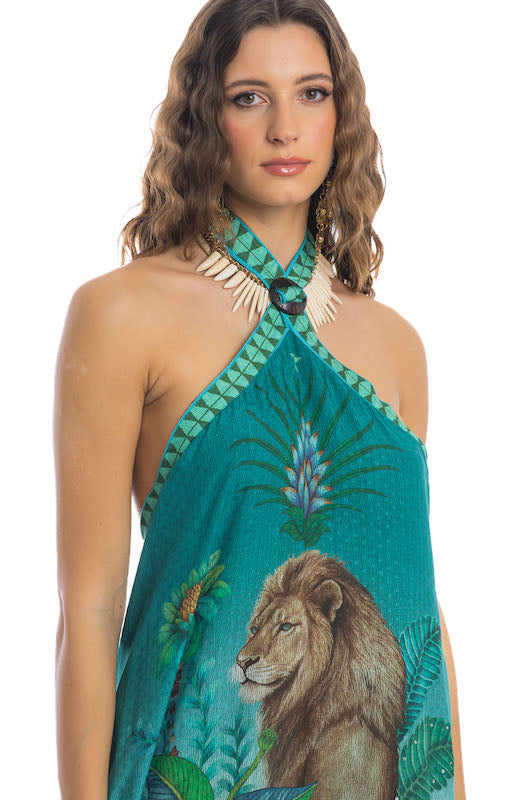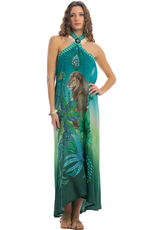 Women's Long Dress Pin Up Stars Light Blue Lion King is embellished with the iconic Lion King print featuring lions immersed in colorful and lush tropical vegetation. Made from soft fabric with a halter neckline.