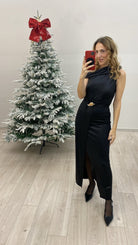 Abito lungo Vicolo scollo asimmetrico con spacco frontale. Con dettaglio fibbia metallo.