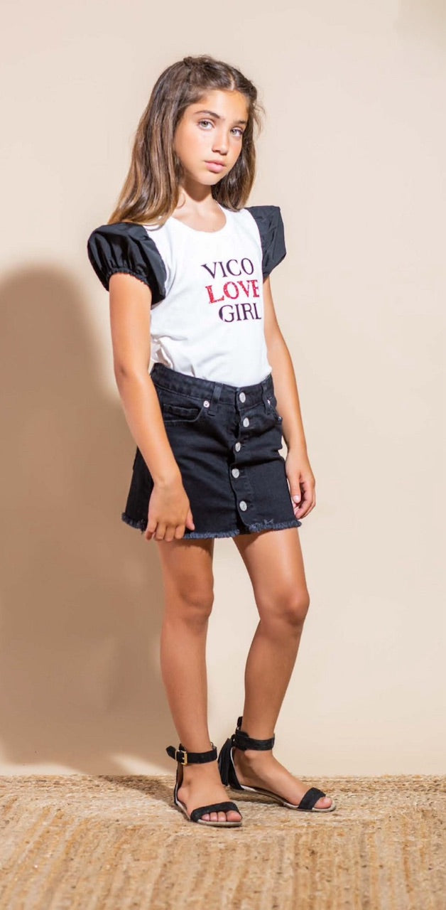 Minigonna in jeans Bambina Vicolo. con bottoni frontali e orlo sfrangiato, 5 tasche. omposizione 98% cotone e 2% elastan. Colore Nero. Taglie 4 anni, 6 anni.